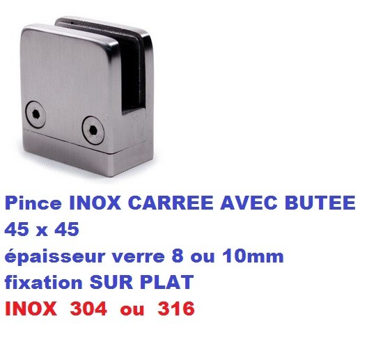 Produit : Pince verre forme carrée AVEC BUTEE fixation SUR PLAT